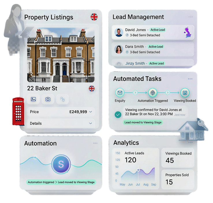 We audit your existing workflows, systems and tools. Then we plug in, integrate and sync your CRM, website, social media, property portals (Rightmove, Zoopla, etc) and email platforms.